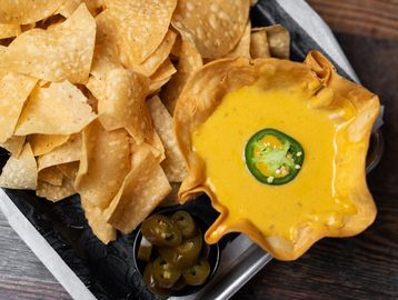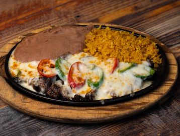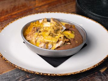 A bowl filled with your choice of fajita meat, rice, refried beans, and topped with queso. Served with tortillas.