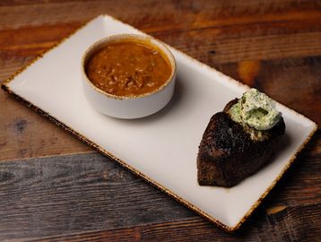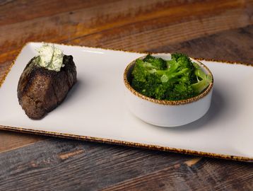 8oz Hand-cut filet, chefs butter, your choice of side, and a salad bar trip.