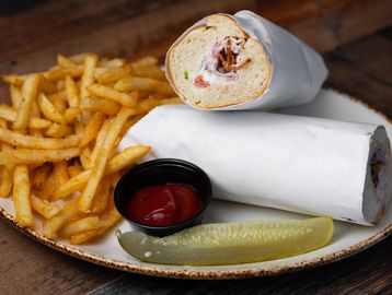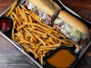 Tender cuts of beef, peppers, onion, and melted cheeses on a toasted baguette. Served with French Fries and Au jus for dipping.
