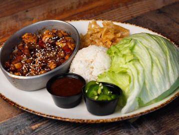 Crispy romaine cups with seasoned chicken, steamed rice, jalapeños, sesame seeds, spicy peanut sauce, and crispy wonton strips.