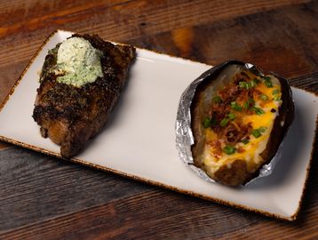 14oz Hand Cut USDA Choice Angus ribeye, charbroiled topped with Chef's butter, your choice of side, and a salad bar trip.