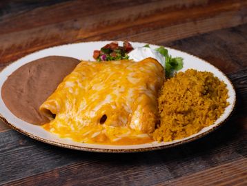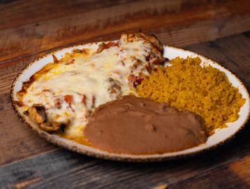 3 Enchiladas stuffed with cheese and topped with chili con carne or queso served with refried beans, and Mexican rice.