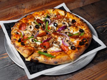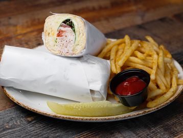 Roasted turkey, ham, bacon, muenster cheese, spring mix, marinated Roma tomatoes, red onion, mayo & sub oil on an Italian roll. Served with Chips or French Fries.