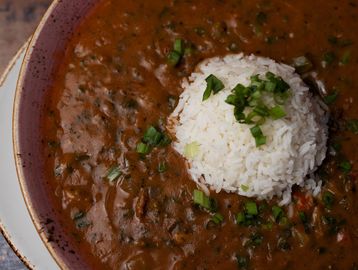 Served 3 smoked chicken enchiladas topped with cajun cream sauce served with refried beans, and Mexican rice.