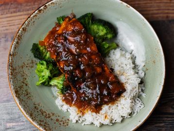 Grilled Wild Atlantic Salmon, tropical heat glaze, broccoli, white rice, and a trip to the salad bar.