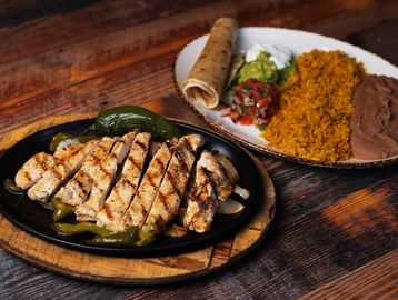 Your choice of Lime marinated steak fajitas, or grilled chicken served with Mexican rice, refried beans, pico, sour cream, guac, and flour tortillas.