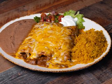 3 Enchiladas stuffed with seasoned ground beef, topped with chili con carne or queso served with refried beans, and Mexican rice.